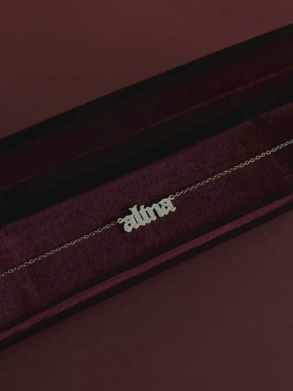 A bold, striking statement with its edgy, gothic-inspired lettering. Perfect for adding attitude to any outfit, it stands out beautifully on its own or layered for extra impact.